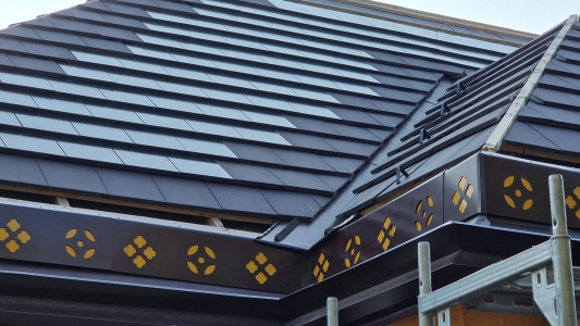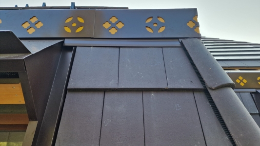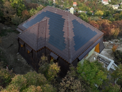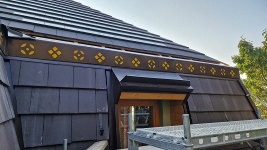Különleges a két eltérő színű bevonatos PREFA lemezből készített dísz, ami elválasztja a manzard tető két síkját egymástól. Gondosan kidolgozott az álló tetőablakokat szegélyező bádogos munka, különösen a felépítmény tetejének megmunkálása egyedi. Látványos a panoráma irányába néző ácsolt terasz és annak nyeregidomú lefedése, amely a manzard tetővel összemetsződik. Szép a tető sötétbarna színe és a látszó fafelületek élénk sárga színének kontrasztja.