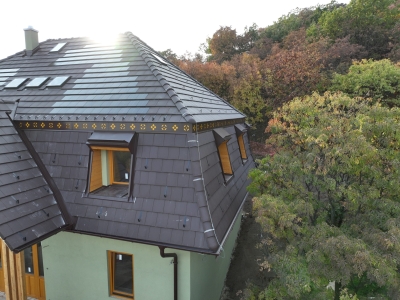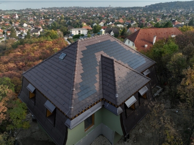 A Balatonra néző, manzárd tetővel fedett nyaraló a hegyoldalban helyezkedik el. A tetőfedést Terrán Zenit Max betoncserépből készítették, Terrán Generon elemek telepítésével kombinálva. Az alátéthéjazat Medifol Generon Longlife Plus, amely az ereszvonalon cseppentő lemezre fut ki. Az 5×7 cm-es ellenlécek és az ereszpallóra felszerelt perforált lemezek kiváló átszellőzést biztosítanak a szellőzőcserepekkel együtt.